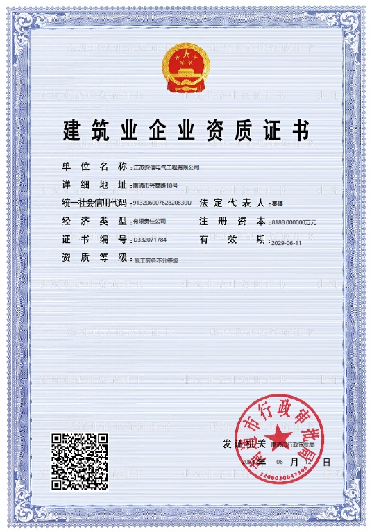 承裝二級、承修二級、承試二級,電力工程施工總承包二級,輸變電工程專業(yè)承包二級,建筑工程施工總承包二級,建筑機電安裝專業(yè)承包二級,地基基礎(chǔ)專業(yè)承包二級